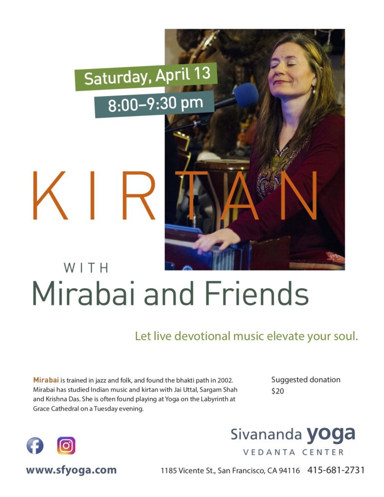 8:00pm Kirtan Concert with Mirabai (Mirabai is trained in jazz and folk, and found the bhakti path in 2002. Mirabai has studied Indian music and kirtan with Jai Uttal, Sargam Shah and Krishna Das.)